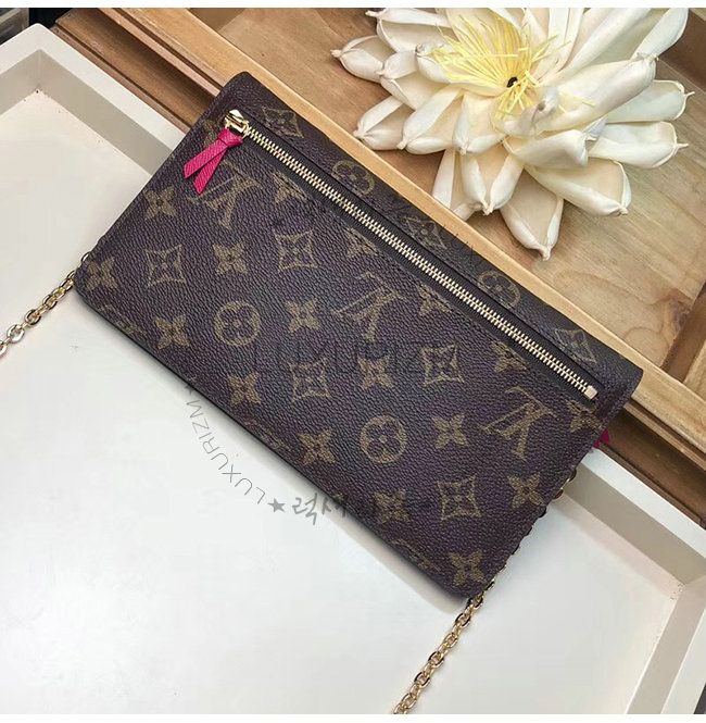 모노그램 캔버스 포쉐트 위크엔드 클러치를 소개합니다. 분리 가능한 체인으로 어깨에 걸칠수있는