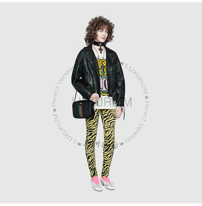 샤이니 가죽, 대조적인 그린 / 레드 웹(Web) 스트라이프 및 더블 G 메탈 장식.