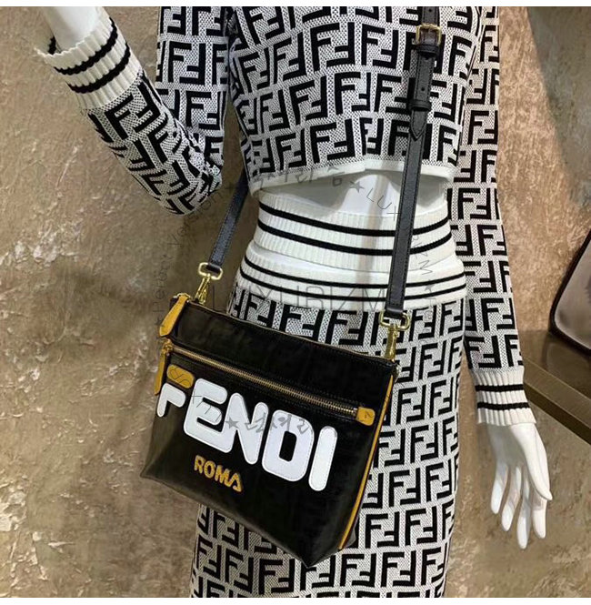 패브릭 소재. FF 모티프 장식. 가죽을 사용한 Fendi Mania 레터링 장식. 골드 피니싱 메탈웨어.