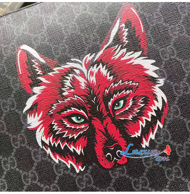 사용된 블랙/그레이 GG 수프림 캔버스 배경에 울프 헤드 모티브 장식.