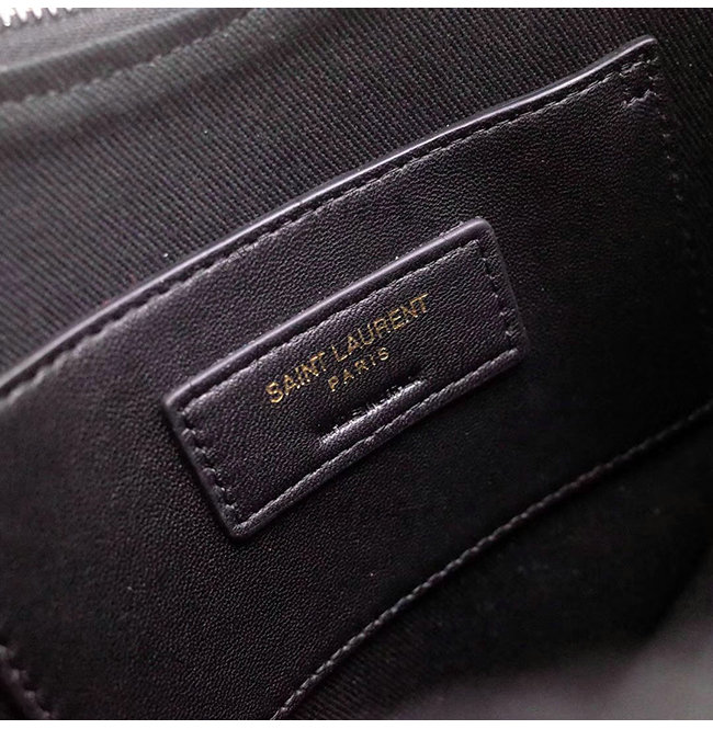 프렌치 드 트림 튜너 및 금속 YSL 이니셜로 지퍼가 달린 조절 가능한 가죽 숄더 백.