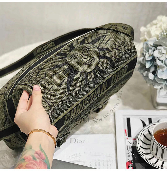 카키 자수 장식 패브릭 Diorcamp 메신저 백.