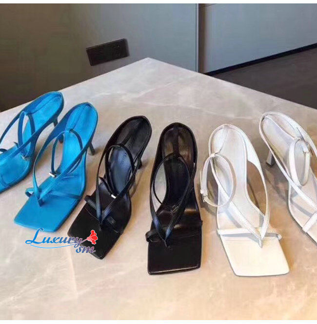 긴 사각 형 형태의 밑창이 돋보 이는 앵클 스트랩 샌들