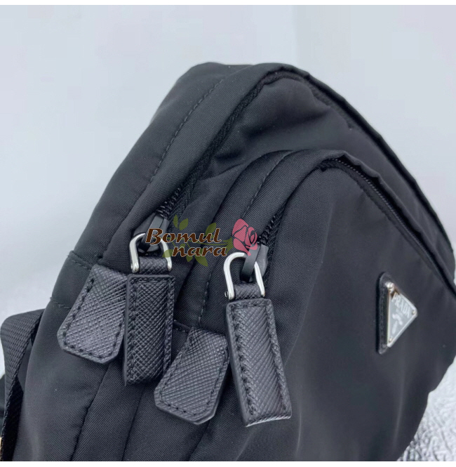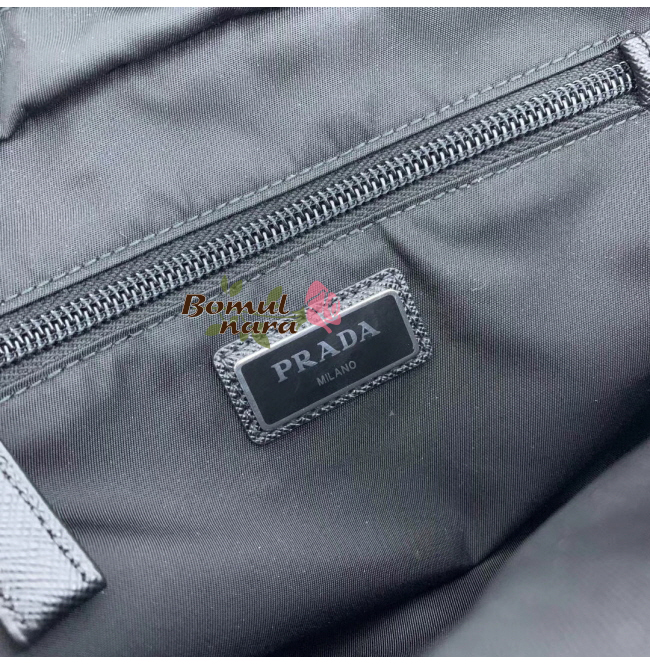 프라다 하네스 백은 역삼각형 로고로 심플하게 완성했다.