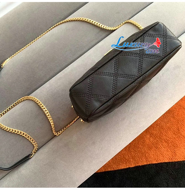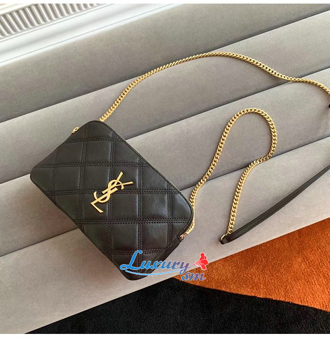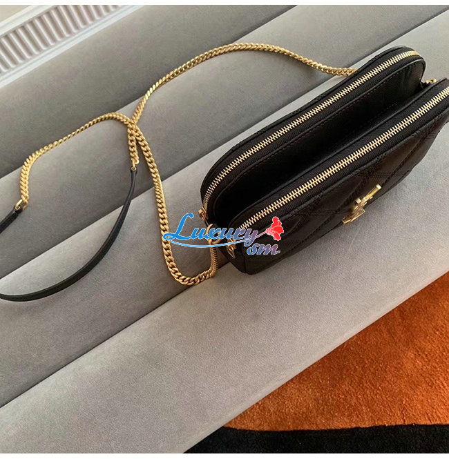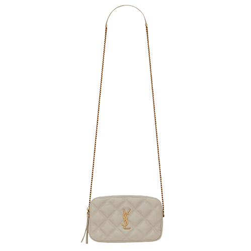 체인과 가죽 숄더 스트랩이 특징 인 메탈 YSL 이니셜로