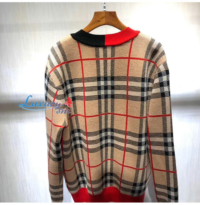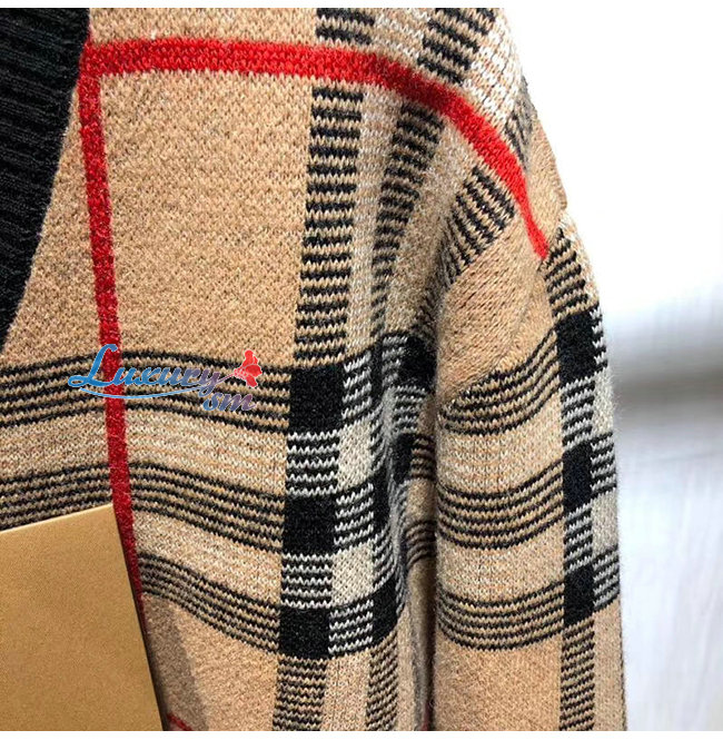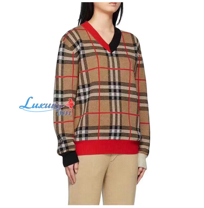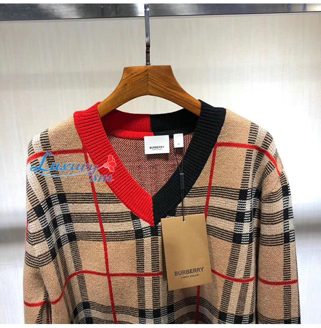 BURBERRY-80236641 버버리 체크 메리노 울 자카드 브이넥 스웨터