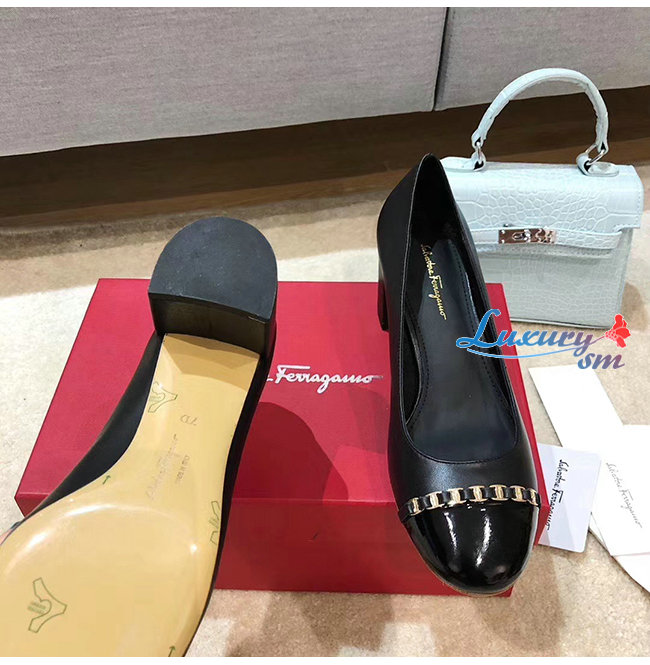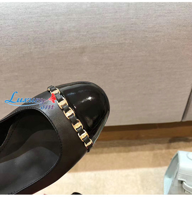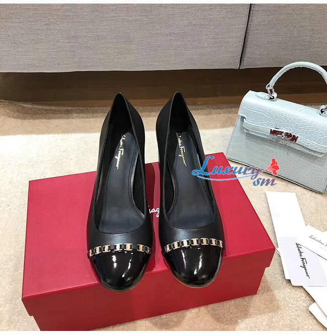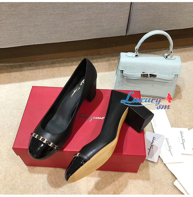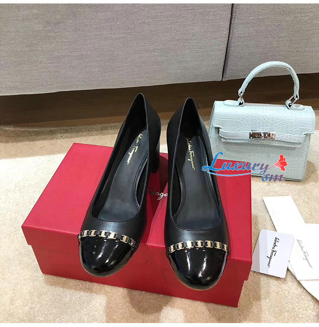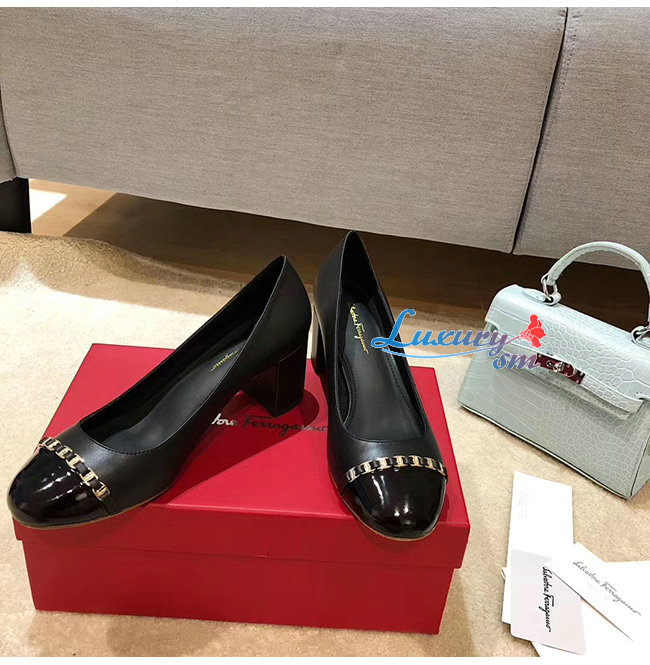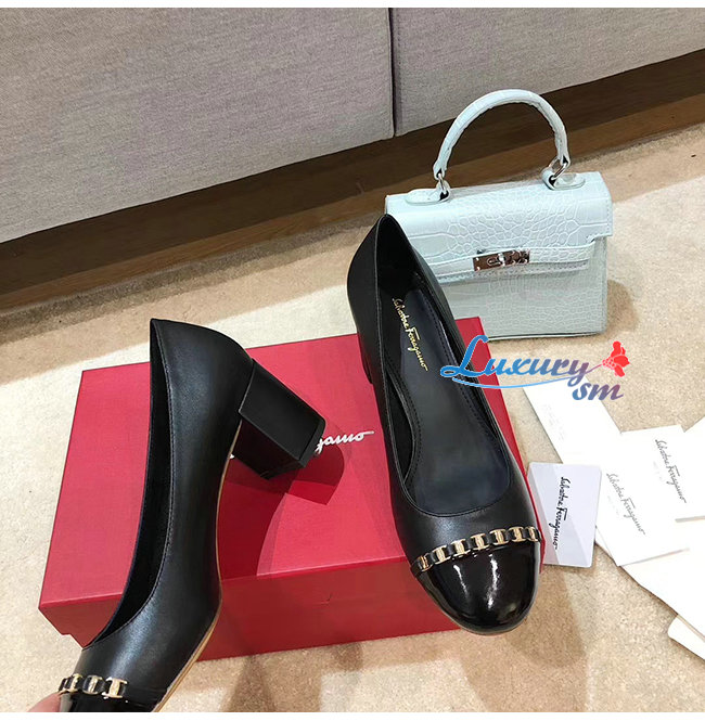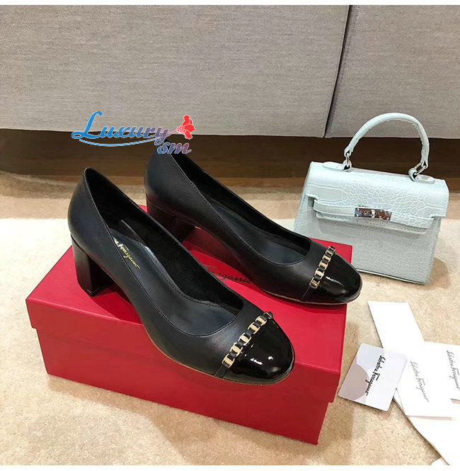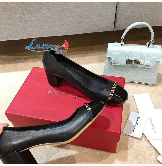 Ferragamo-01P343 페라가모 블랙 페이턴트 카프스킨 바라 체인 펌프스