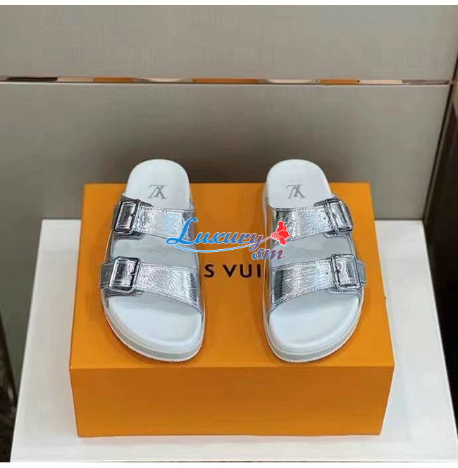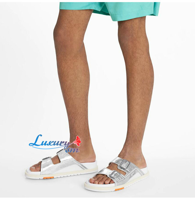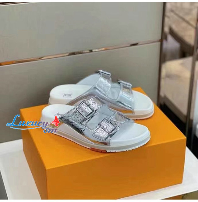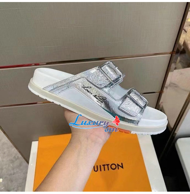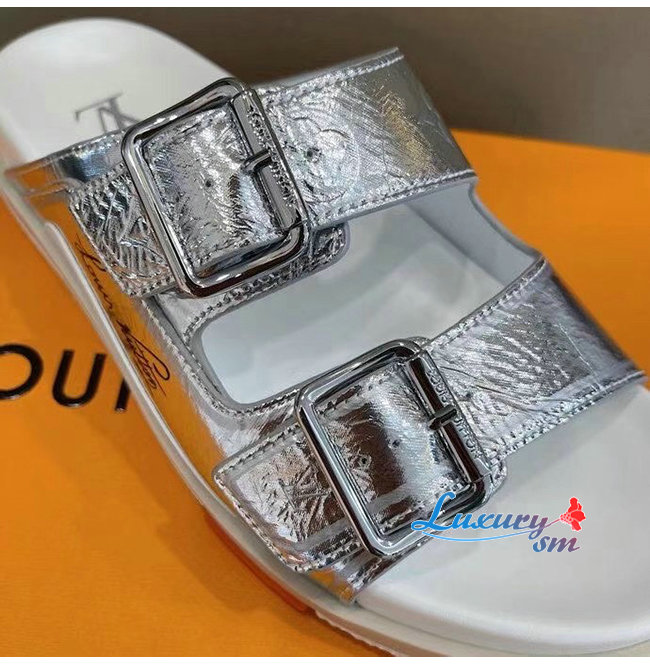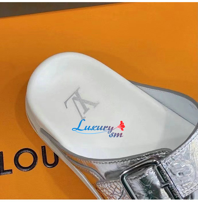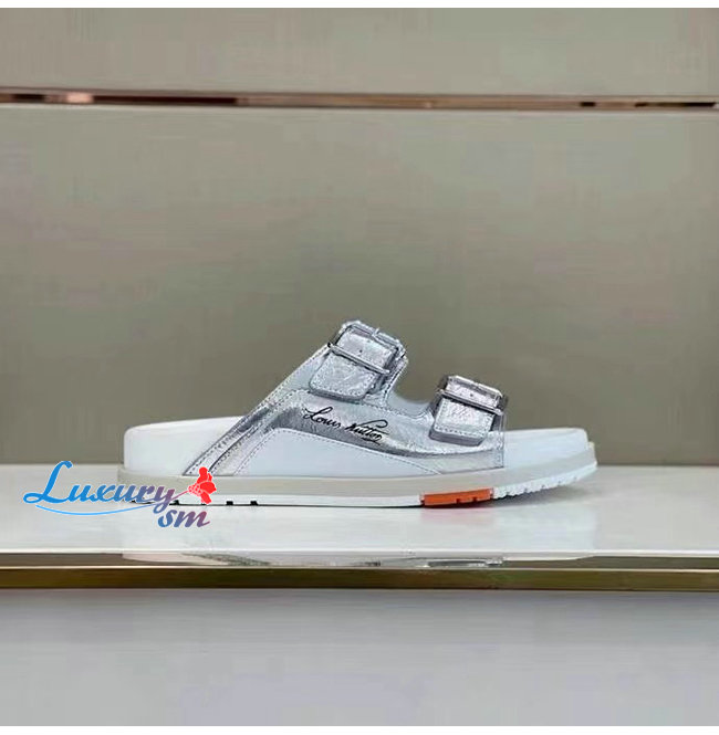 LOUIS VUITTON-1A8SKI 루이비통 실버 메탈릭 가죽 LV 트레이너 뮬