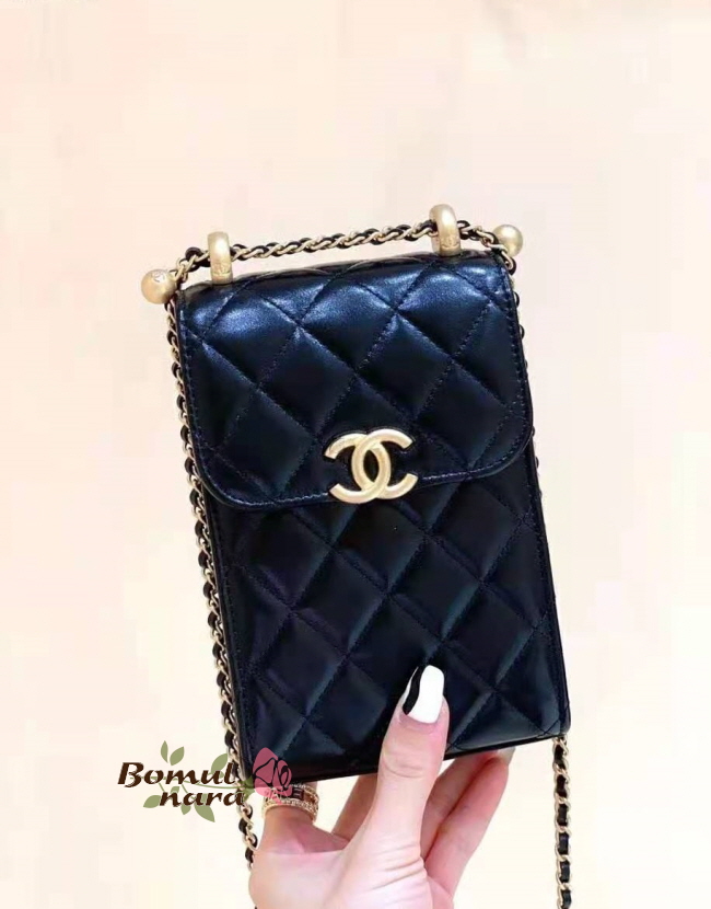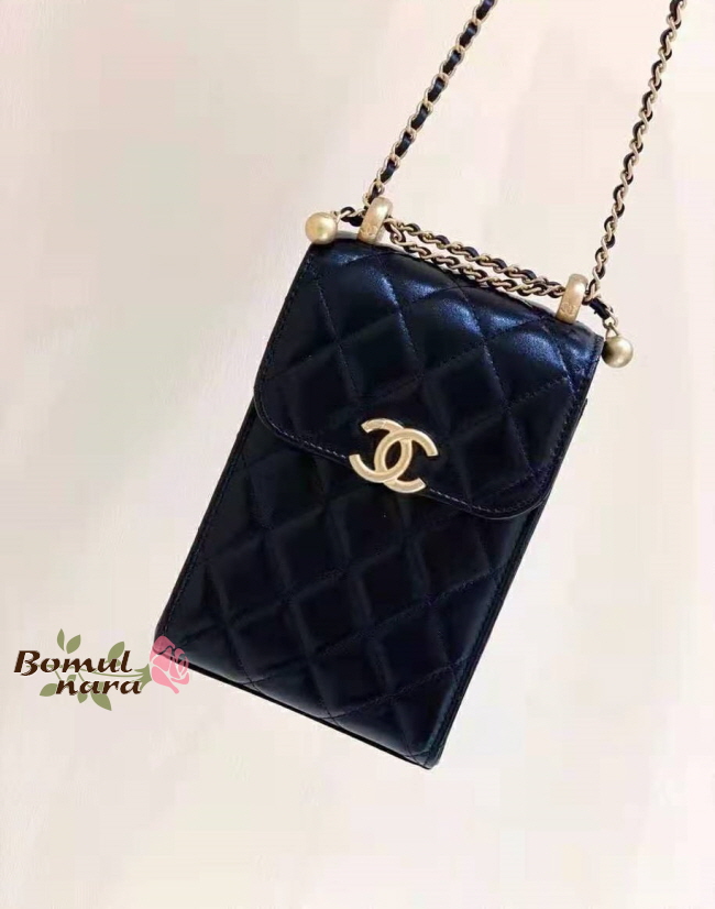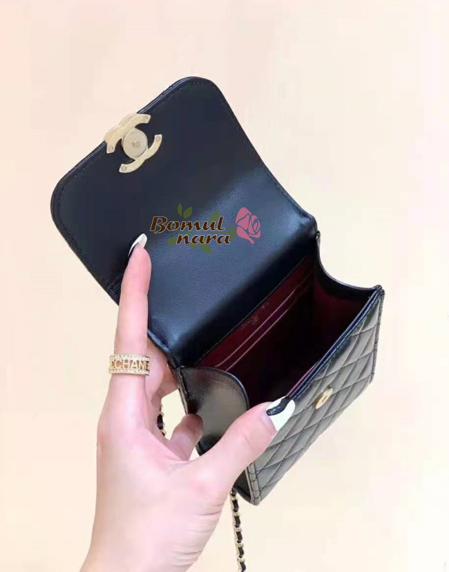 체인달린 미니백으로 체인 끝 샤넬각인이 새겨진