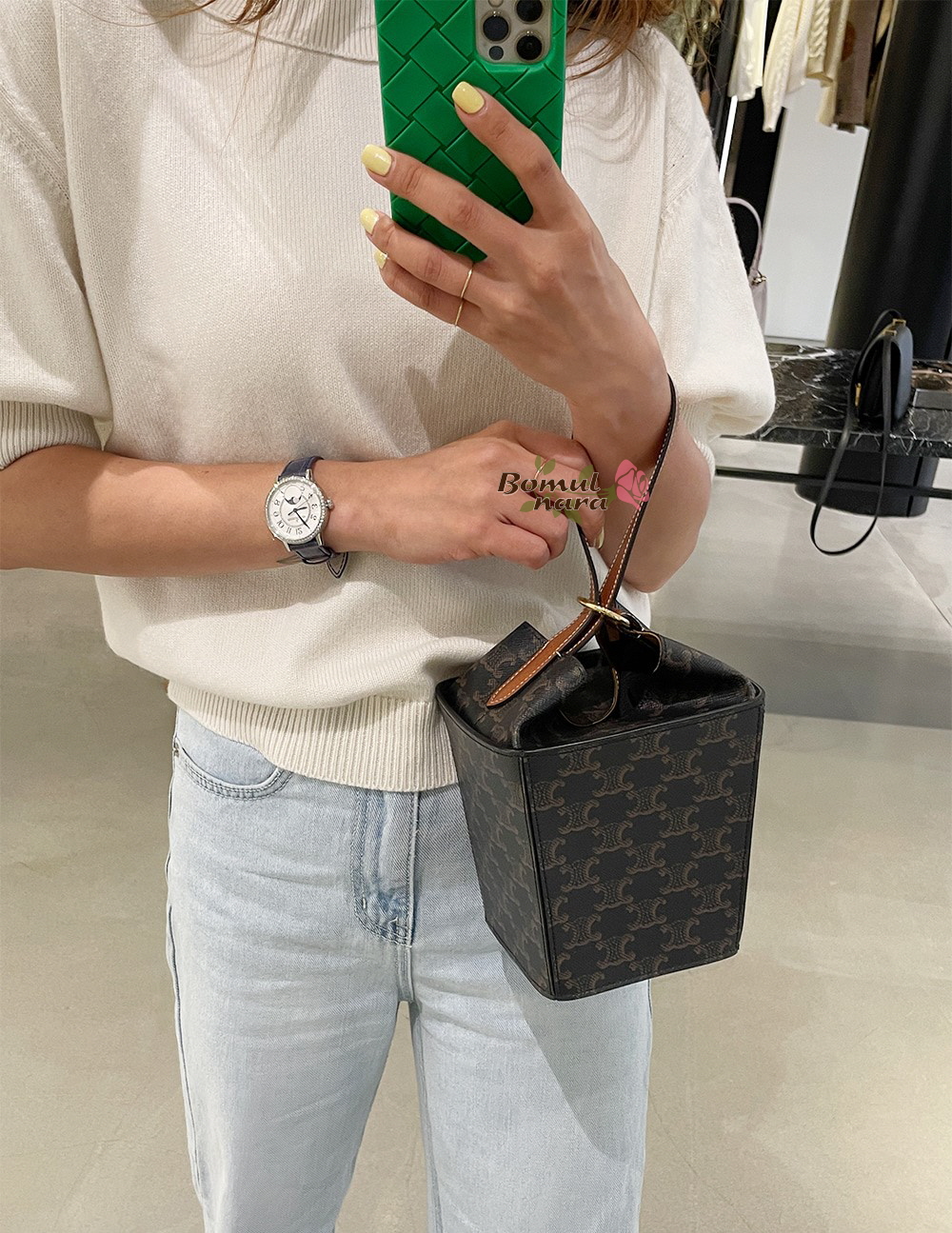 각진 박스쉐입으로 포인트로 착용하기 좋은 버킷