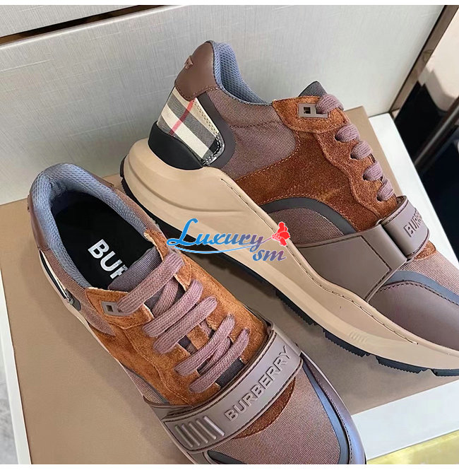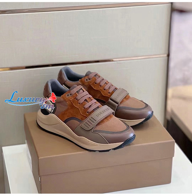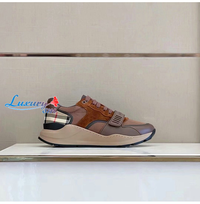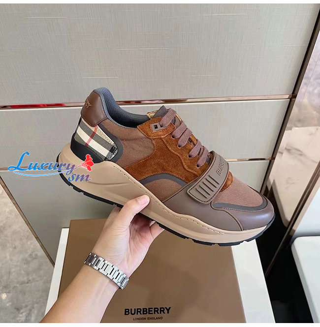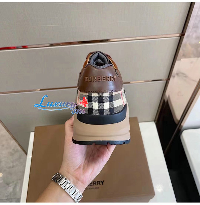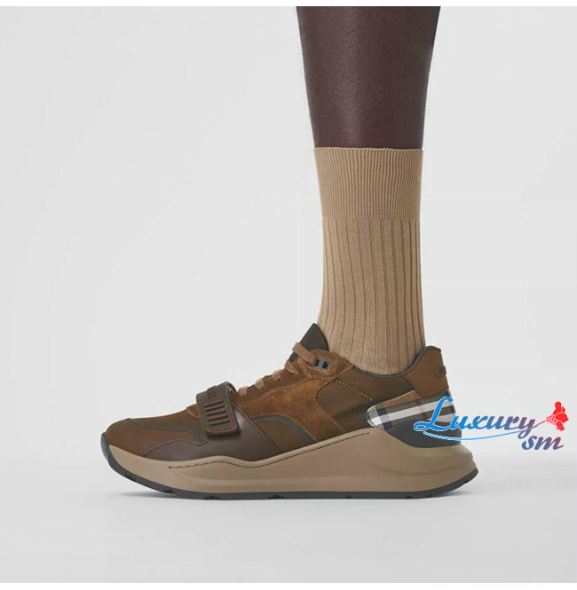 BURBERRY-80458421 버버리 다크 모카 레더 스웨이드 체크 스니커즈