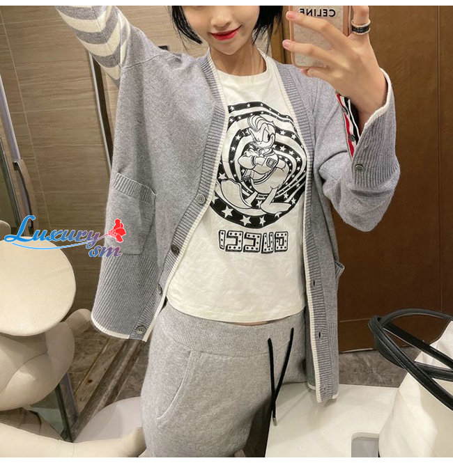 THOM BROWNE-121513 톰 브라운 그레이 니트 코튼 스트라이프 장식 가디건 여성용