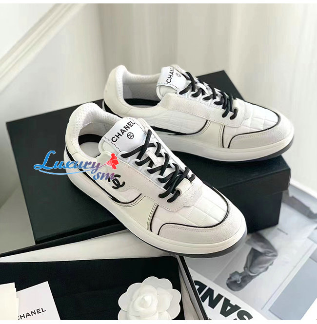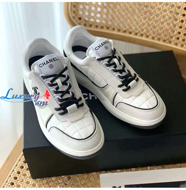 CHANEL-G39802 샤넬 화이트 패브릭 스웨이드 카프스킨 스니커즈 여성용