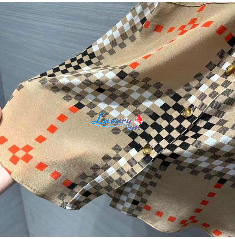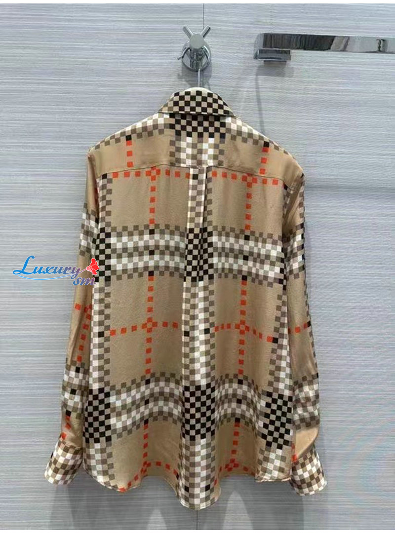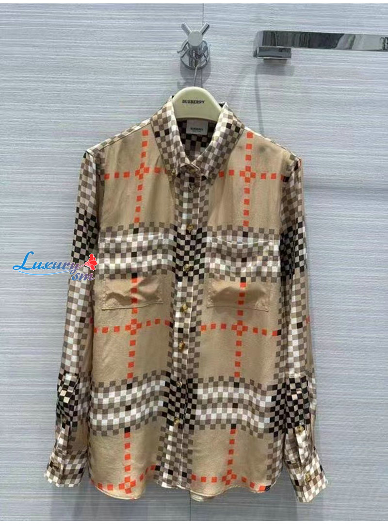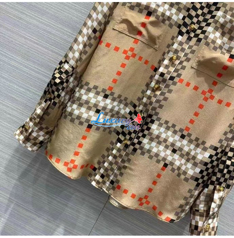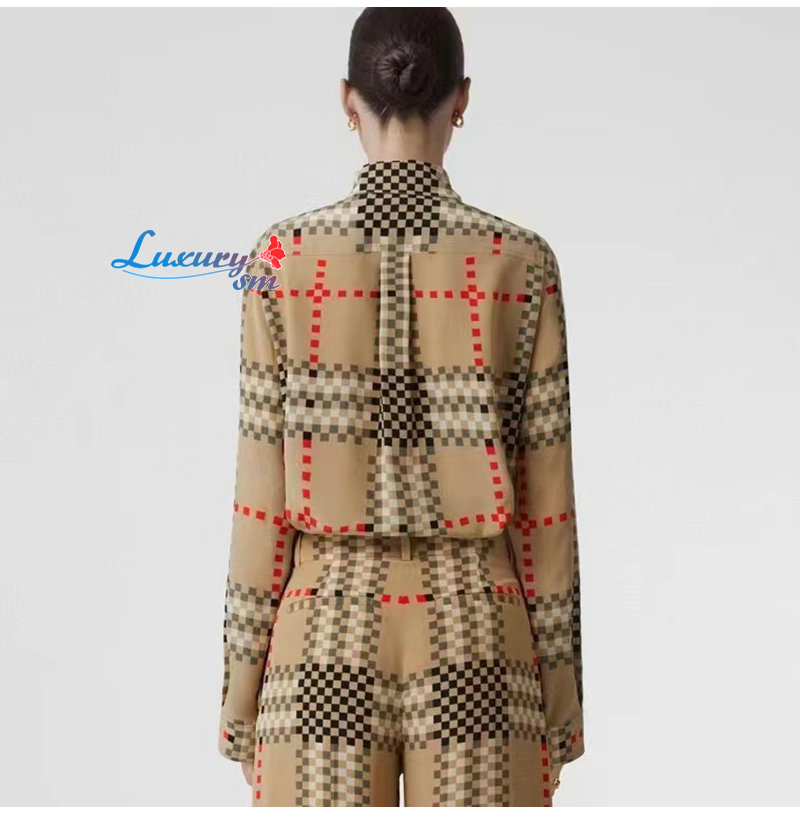 BURBERRY-80632561 버버리 베이지 픽셀 체크 실크 크레이프 드 신 셔츠 여성용