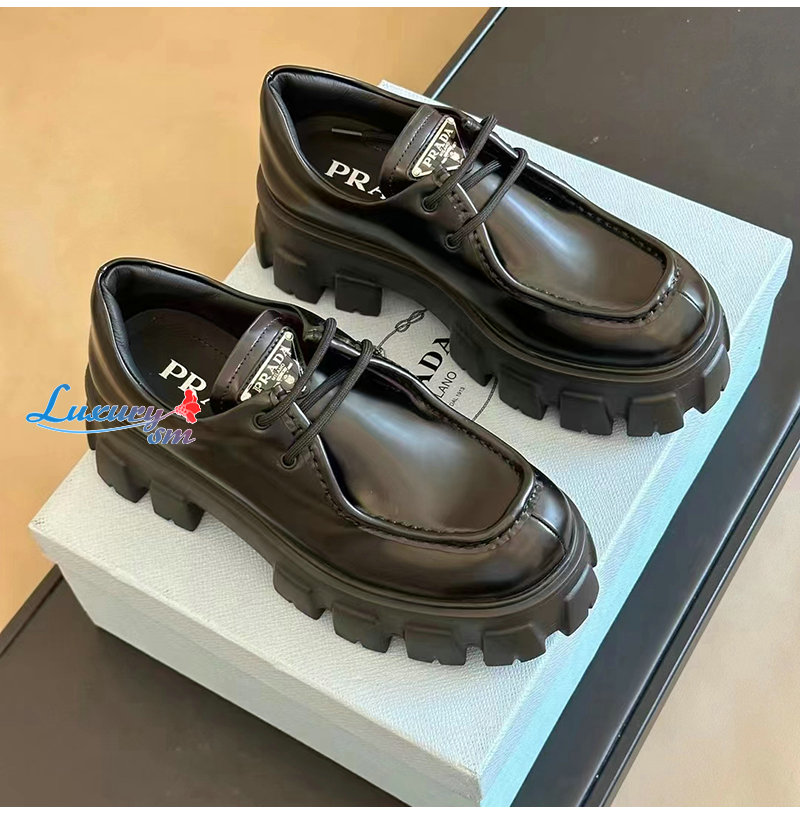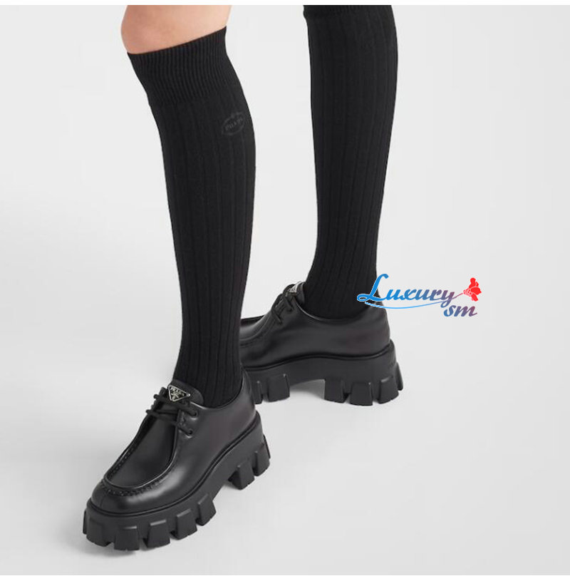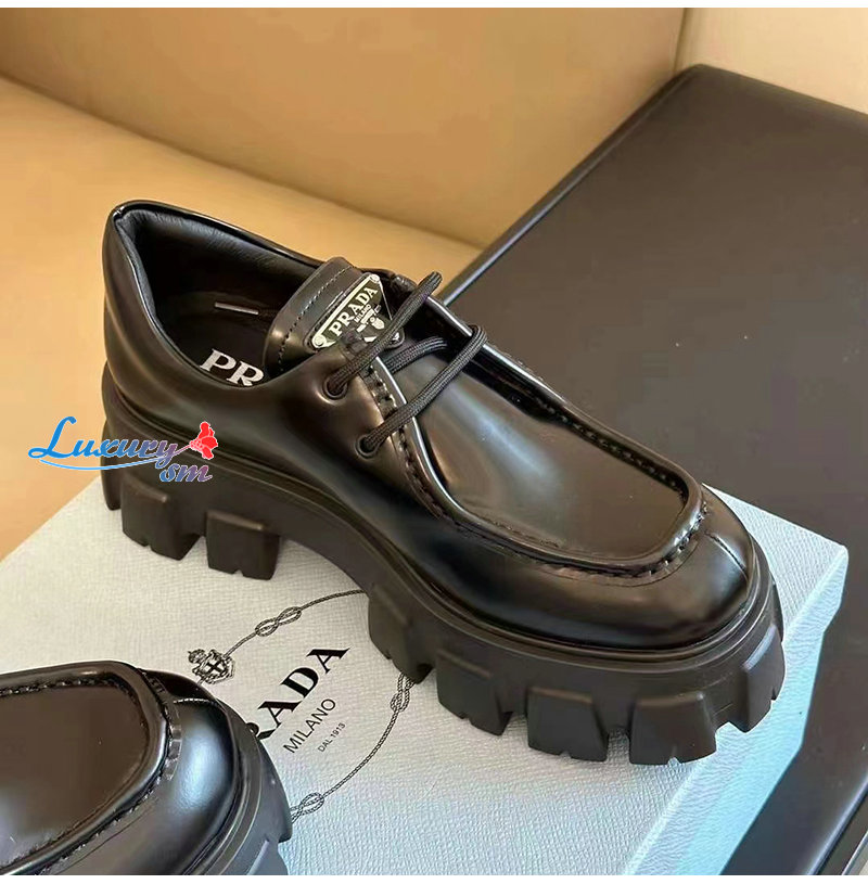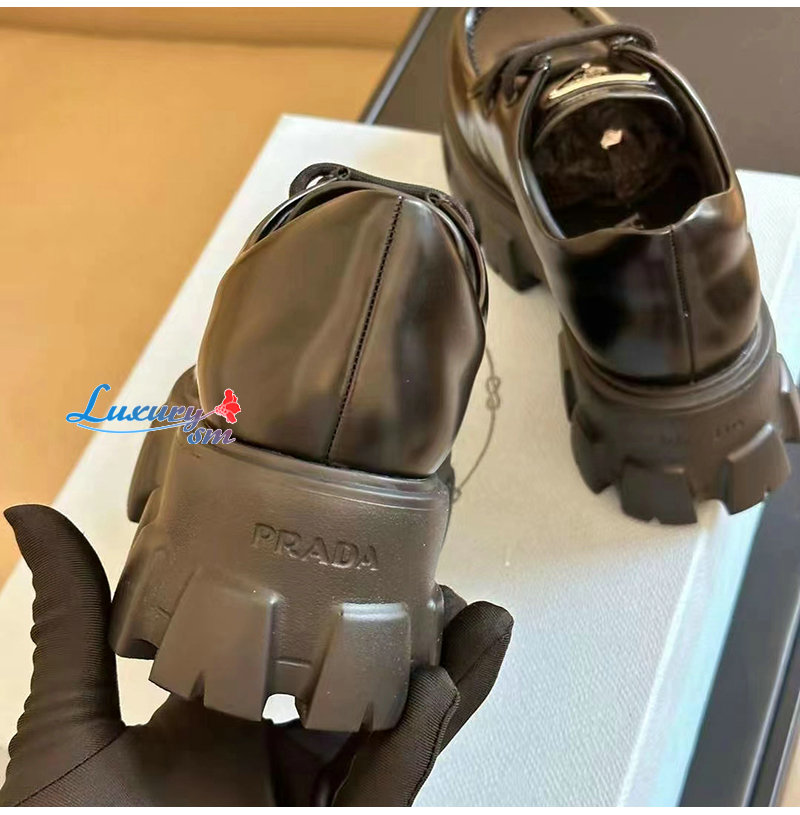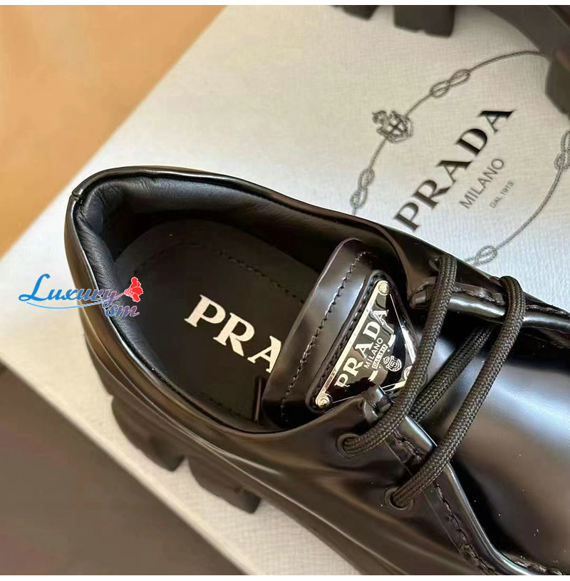 PRADA-1E254N 프라다 블랙 모놀리스 브러시드 가죽 레이스업 슈즈 여성용