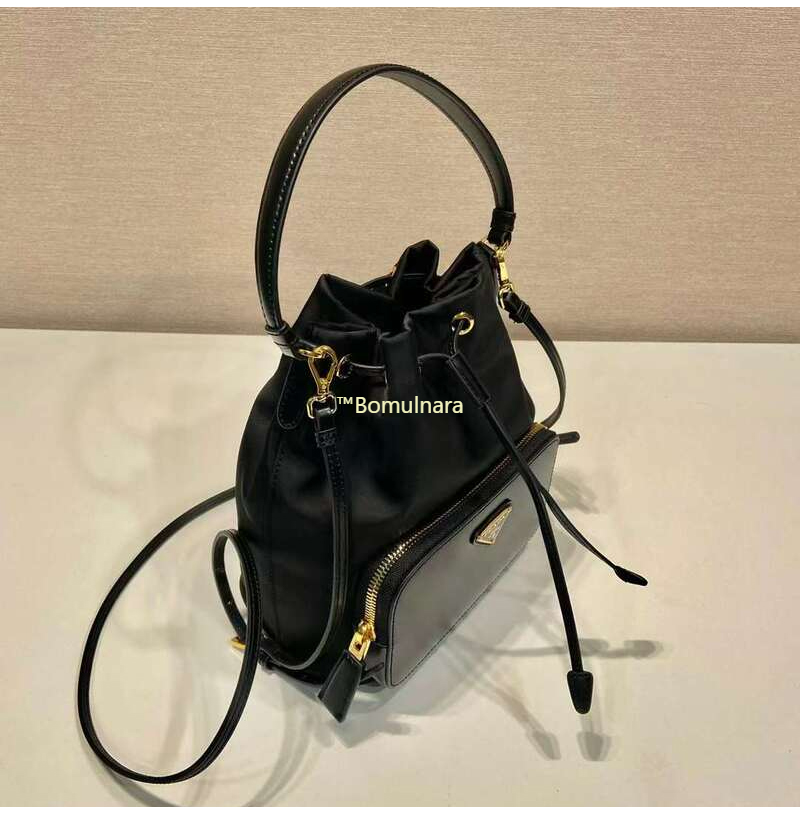 [스페셜오더]PRADA-1BH038 프라다 블랙 리나일론 및 브러쉬드 가죽 포켓 버킷백 17.5CM
