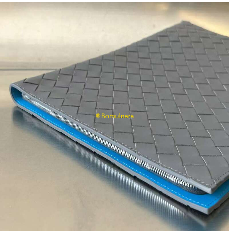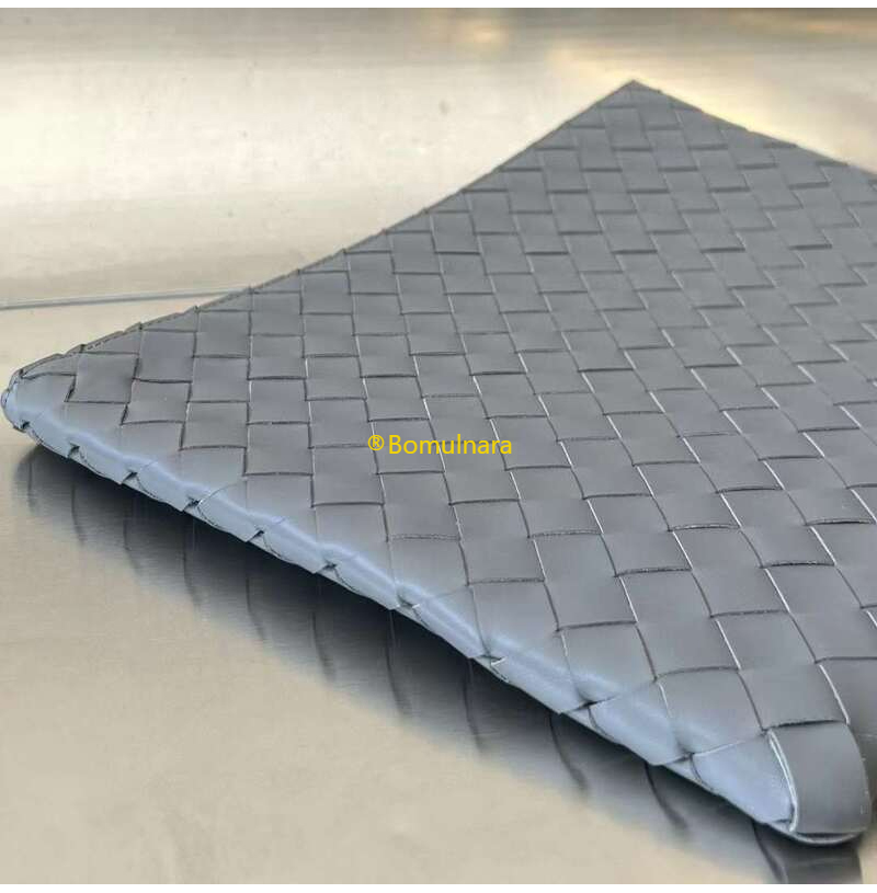 가죽 소재를 인트레치아토 위빙으로 완성한 파우치.