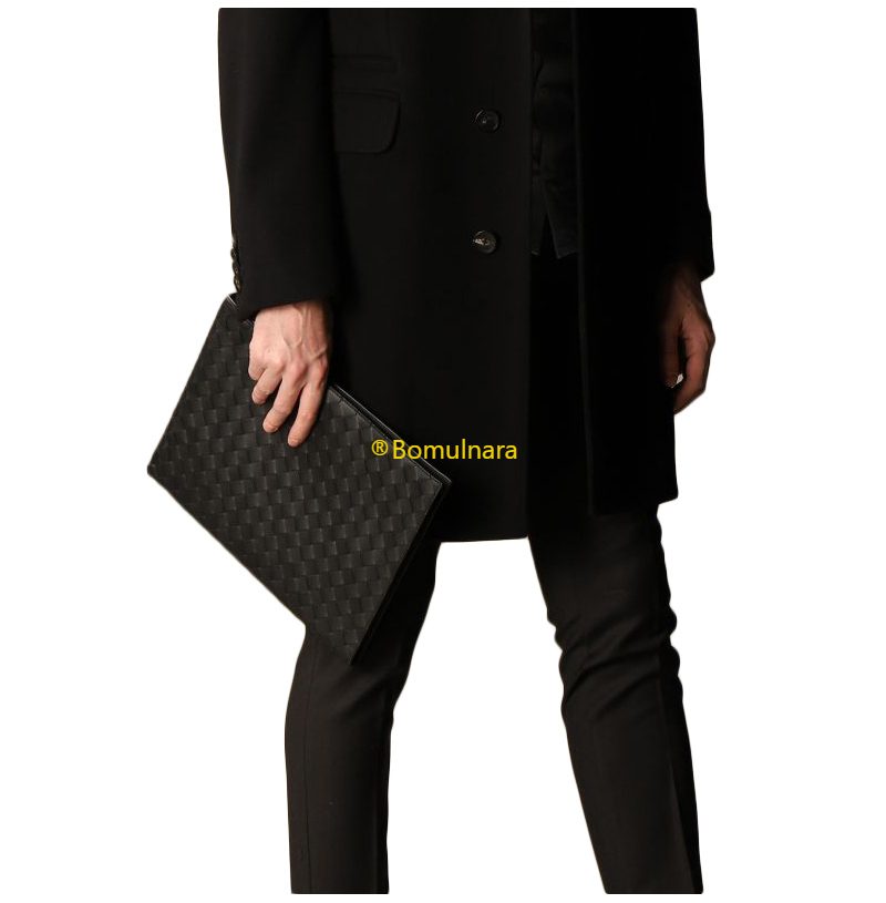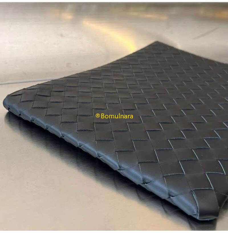 가죽 소재를 인트레치아토 위빙으로 완성한 파우치.