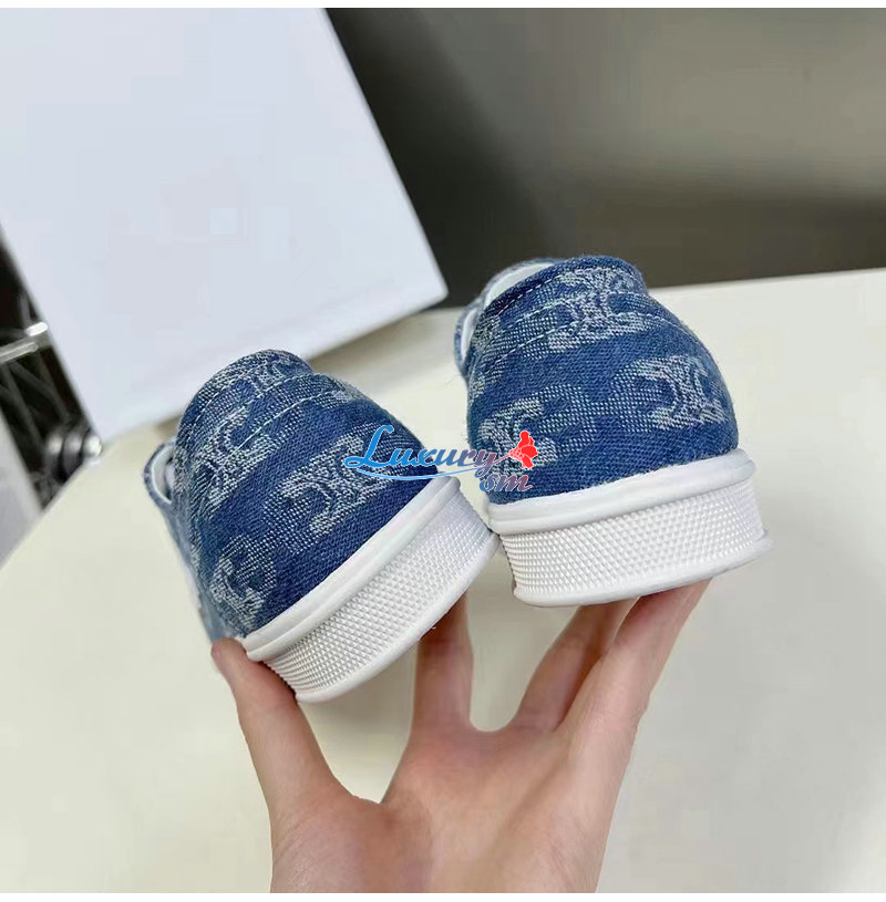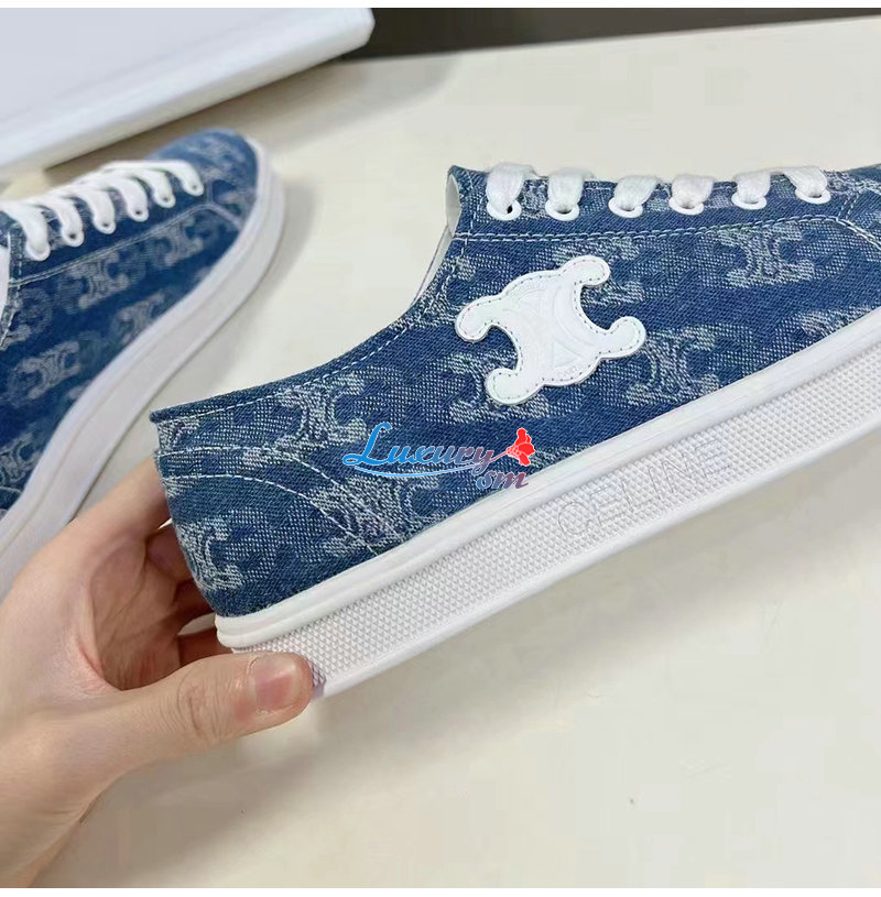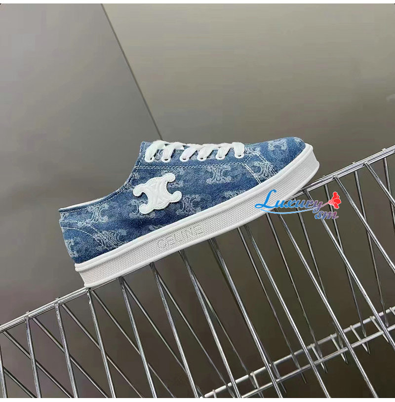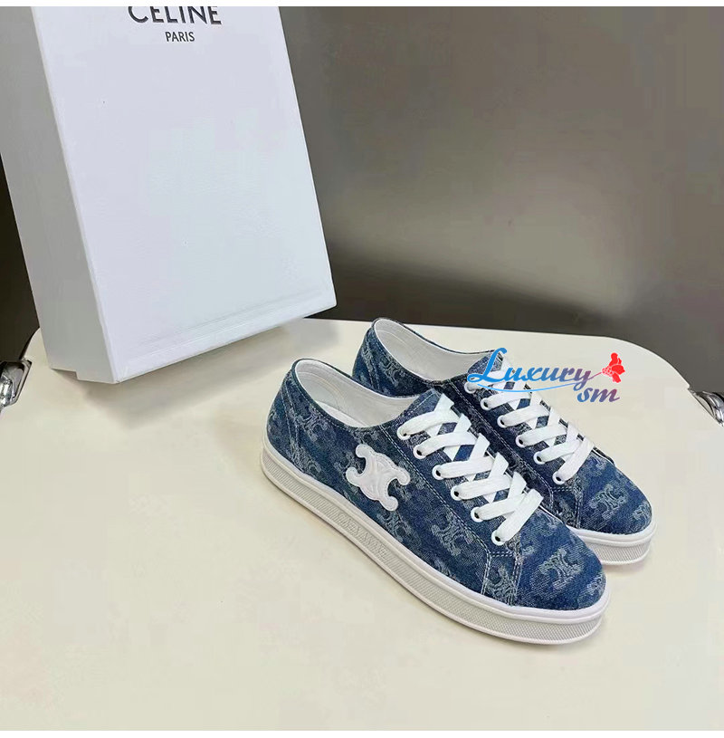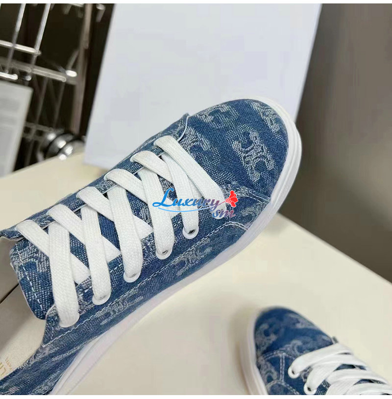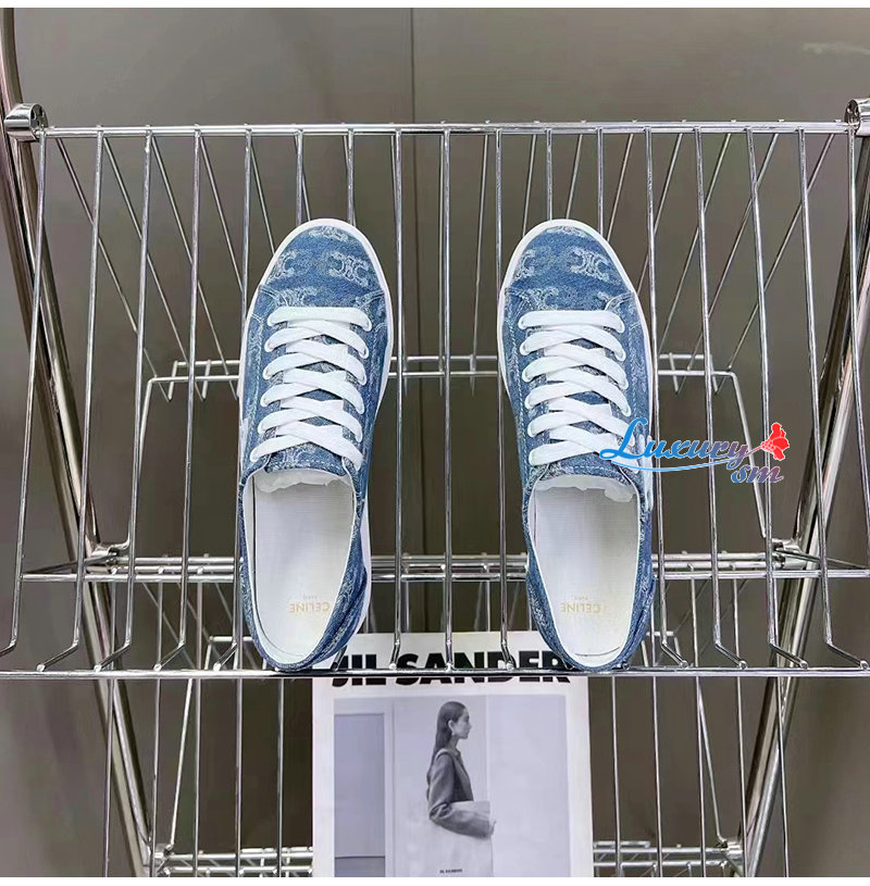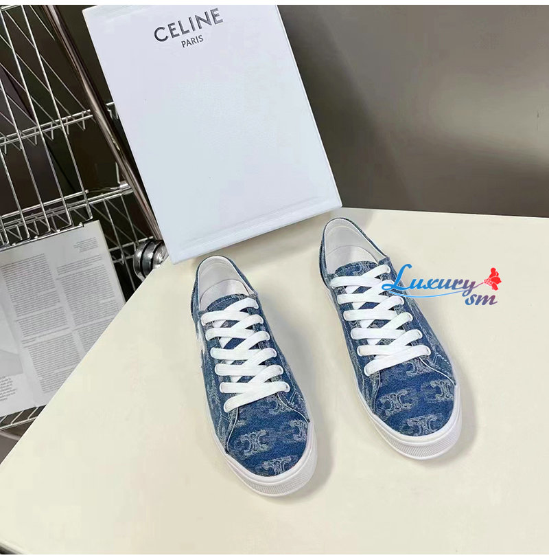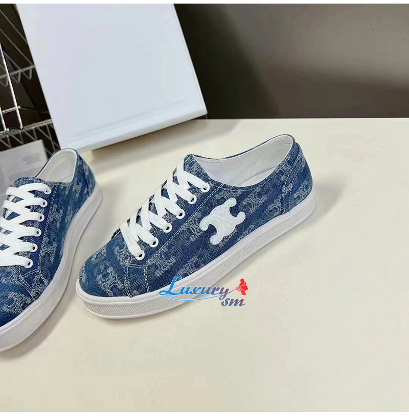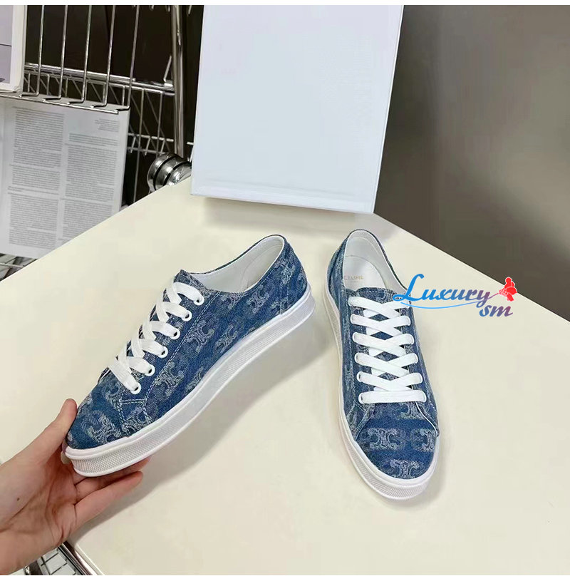 CELINE-358782 셀린느 블루 트리옹프 프린트 데님 레이스업 스니커즈 여성용