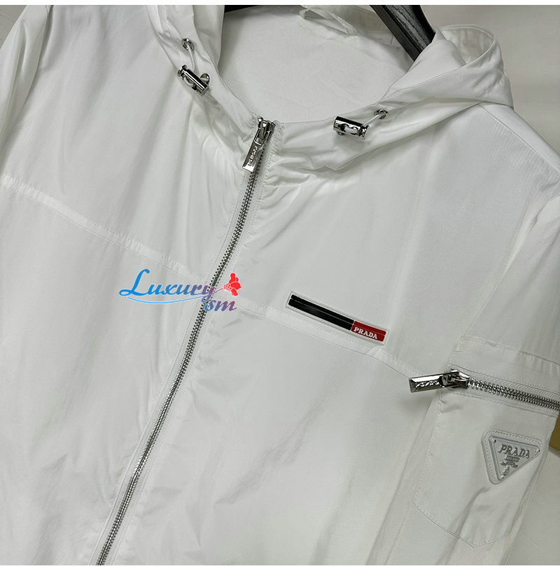 PRADA-03229 프라다 화이트 트라이앵글 로고 바람막이 후드 재킷 남성용