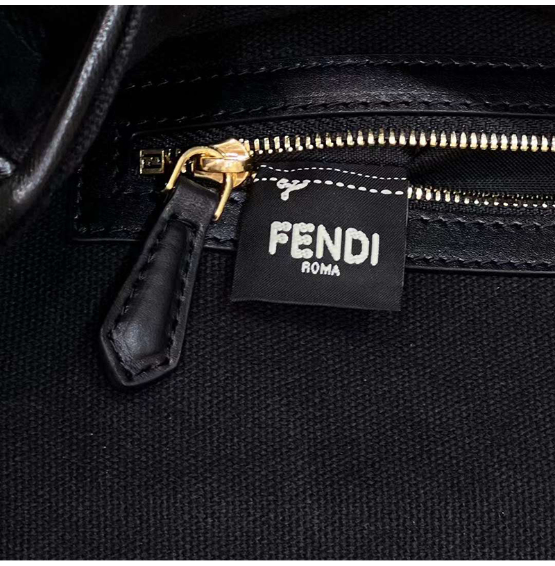 톤온톤 자수로 완성한 볼록한 FF 모티프. 가죽 트리밍과 FF 클래스프 장식.