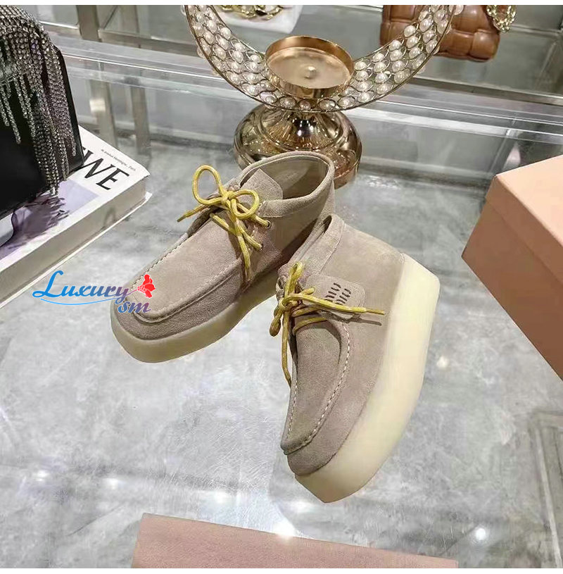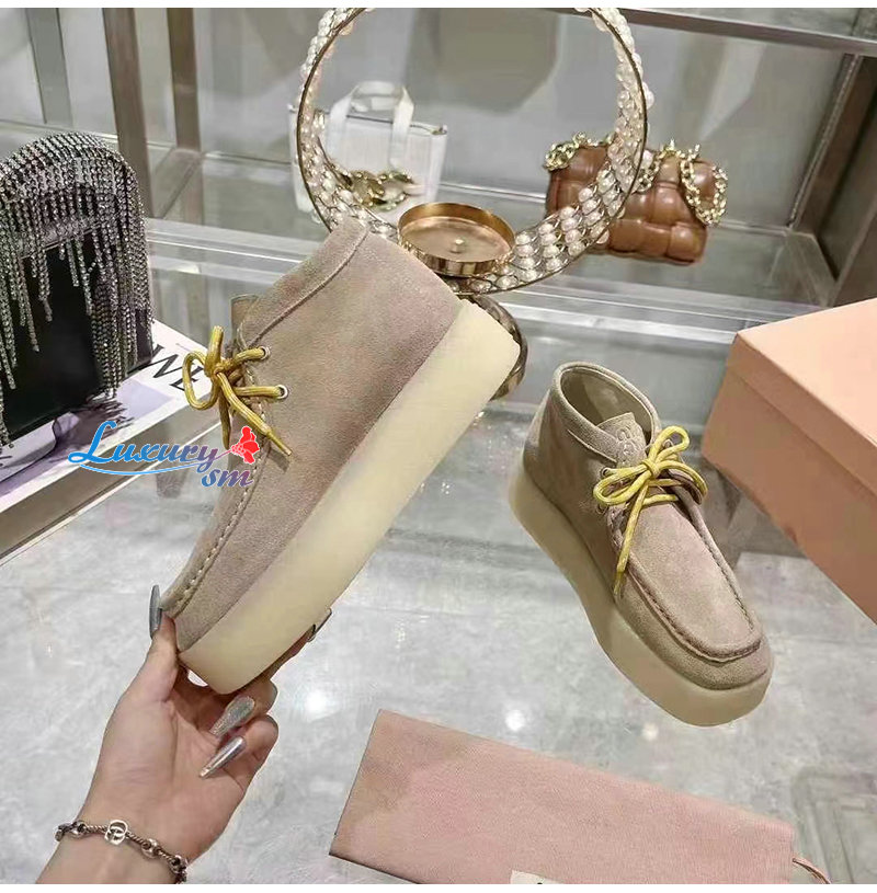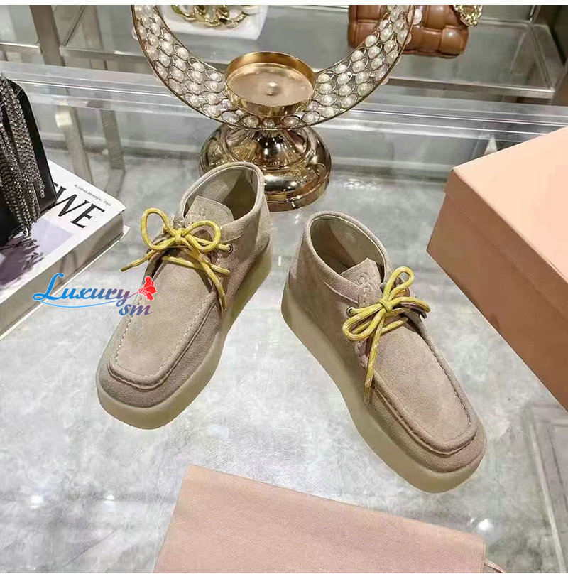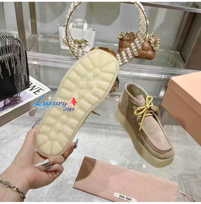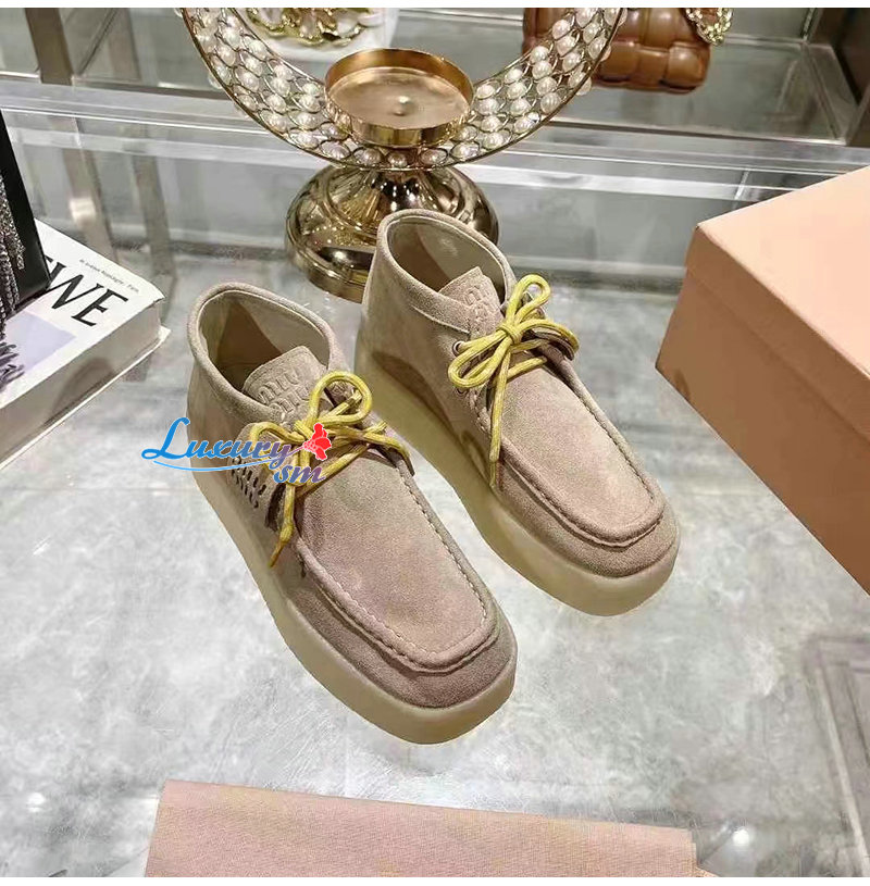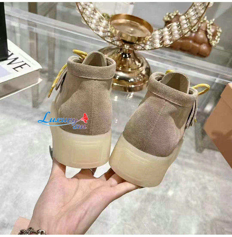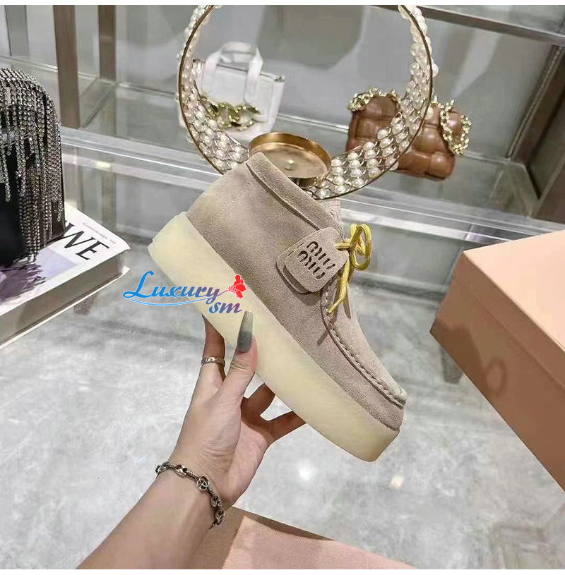 MIUMIU-5T263E 미우미우 베이지 스웨이드 델라베 웨지 앵클 부츠 여성용