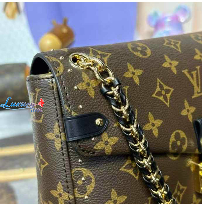 골드 색상 리벳이 장식된 모노그램캔버스 소재.