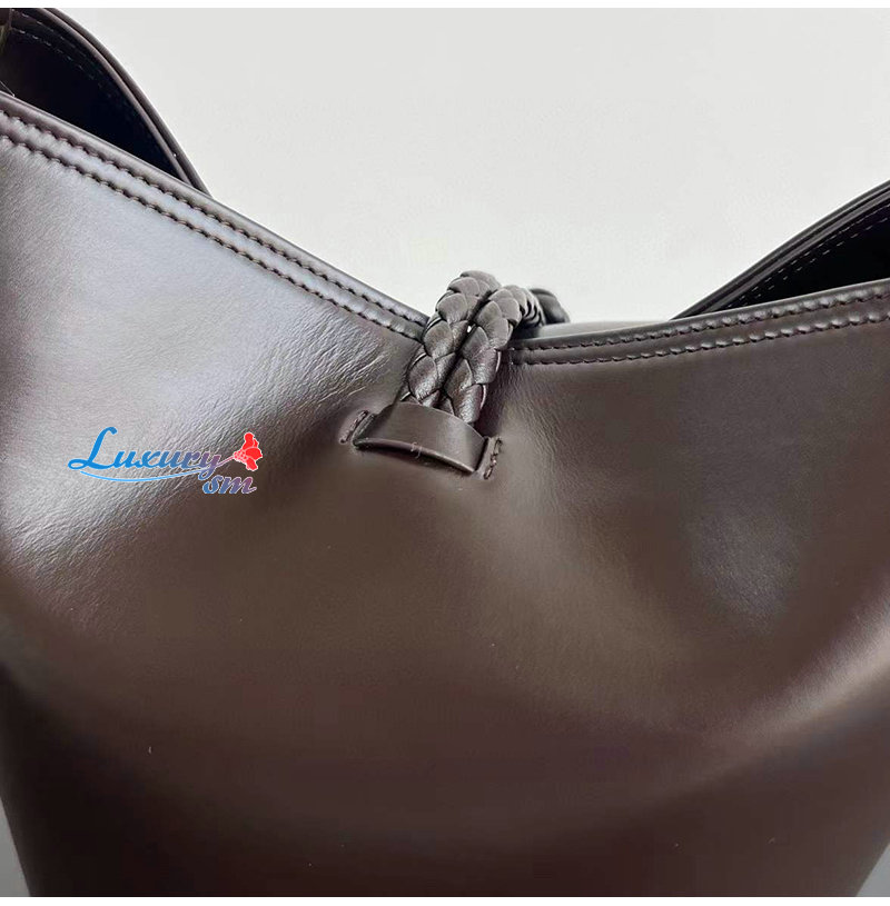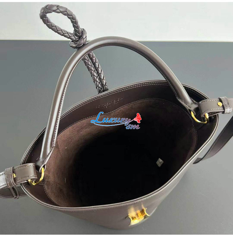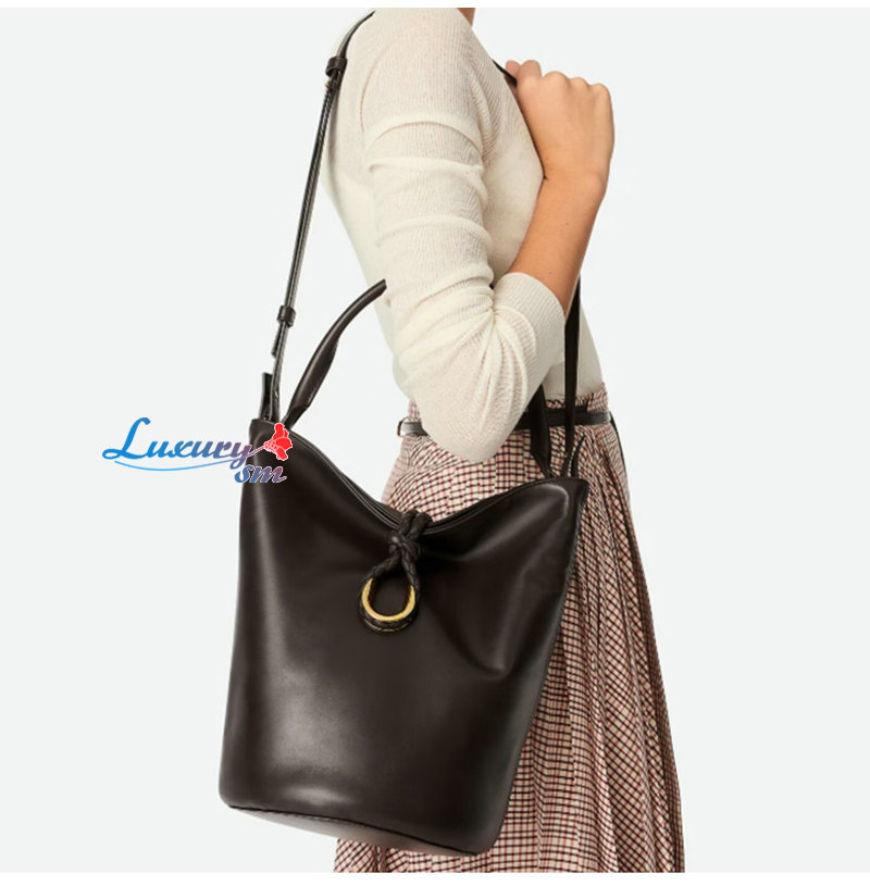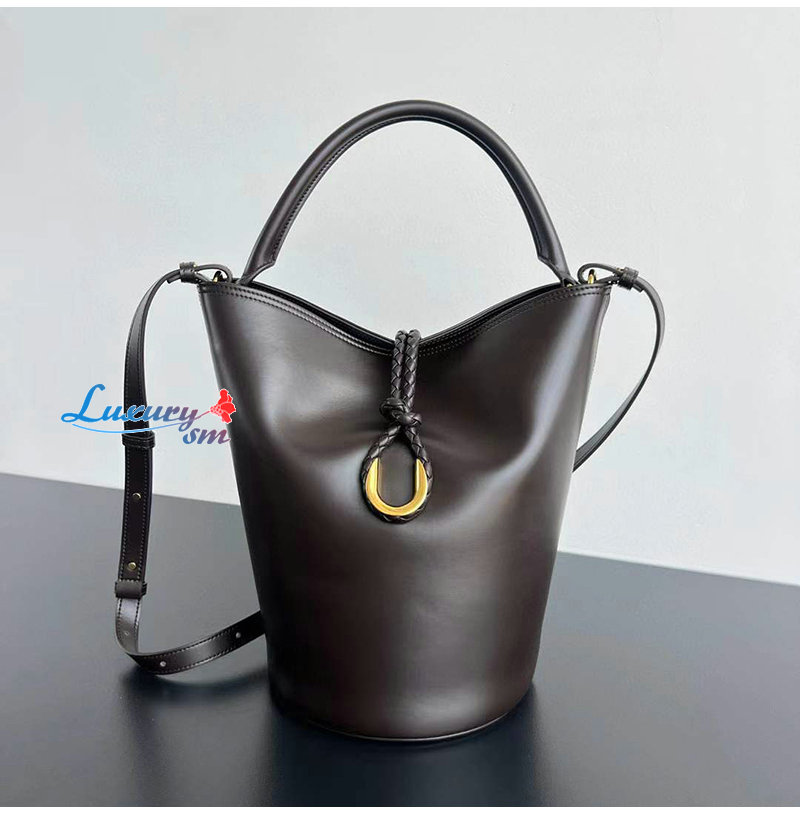 부드러운 송아지가죽 소재의 탑 핸들 버킷 백.